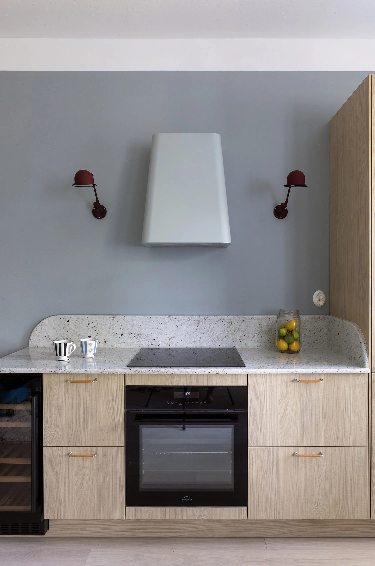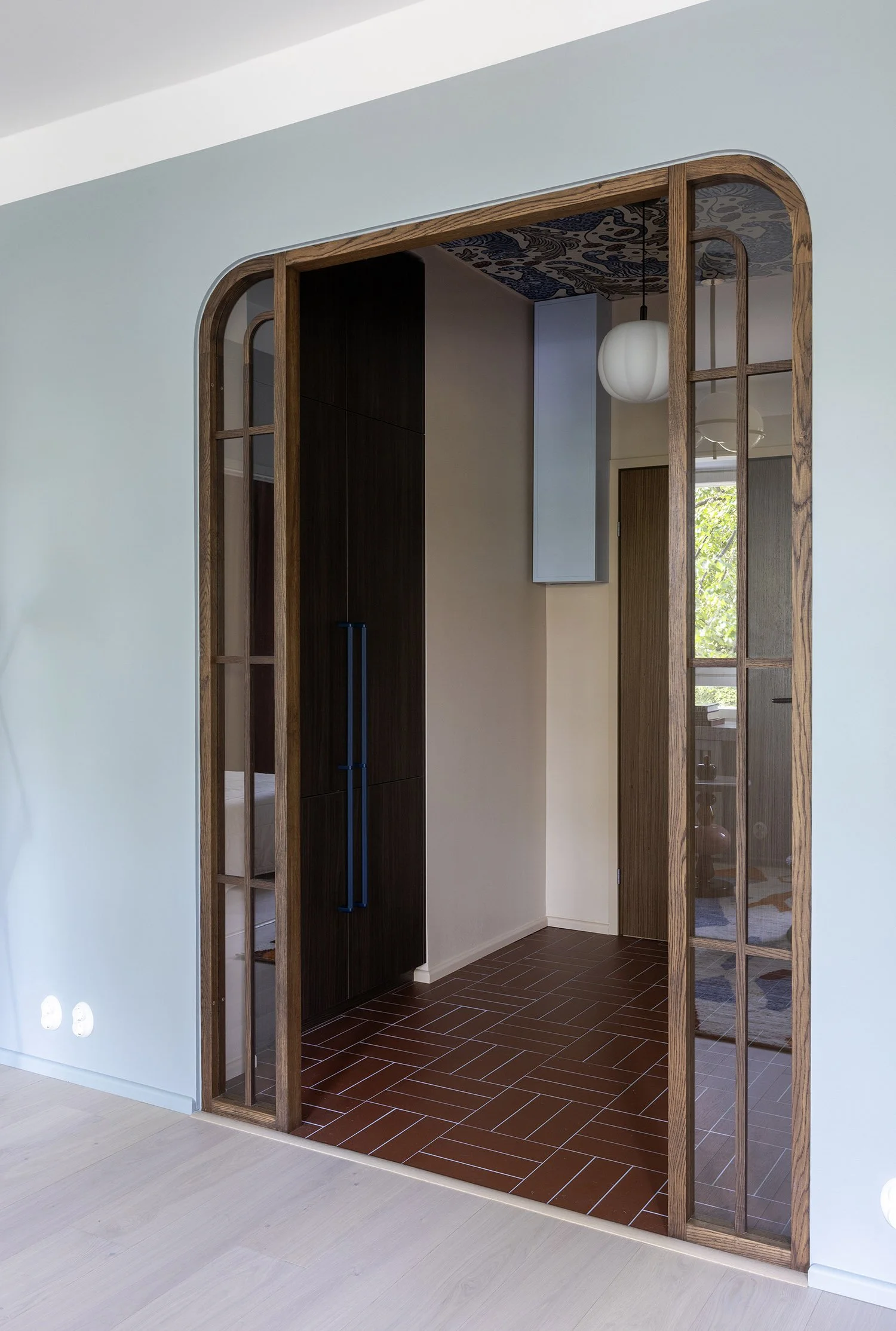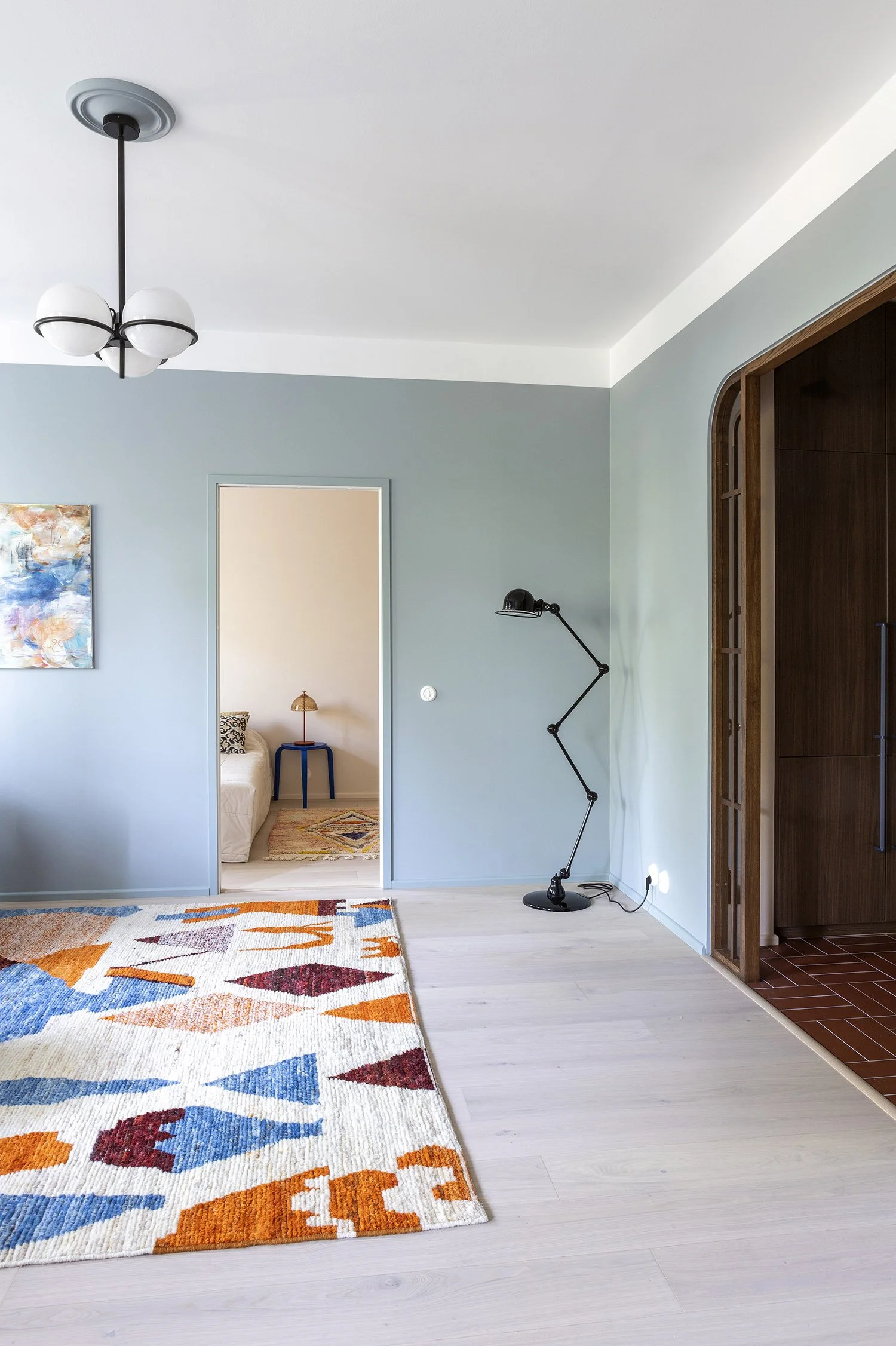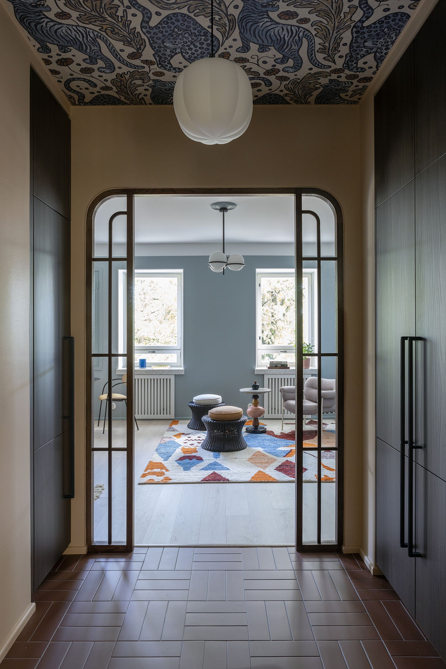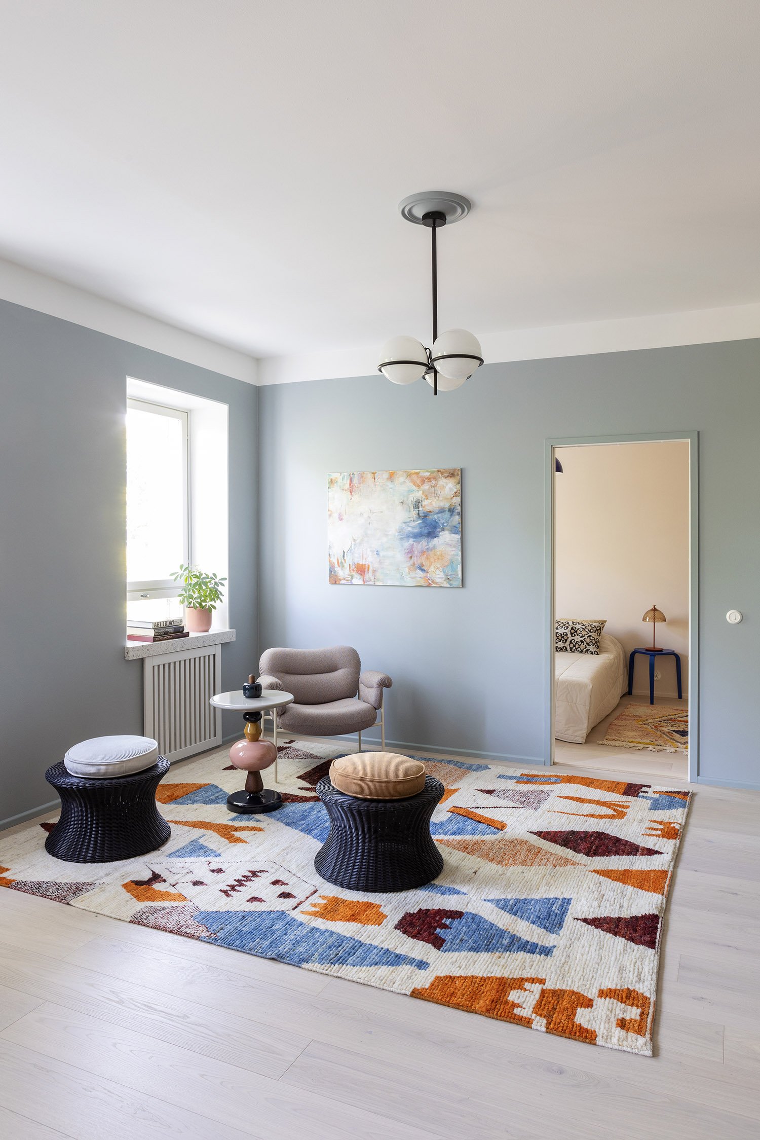 Kruununhaan kaksio uudistettiin kokonaisvaltaisesti saneerauksella ja sisustussuunnittelulla. Seiniä purettiin, vanhat pinnat ja rakenteet purettiin, asennettiin paljon uutta kaappitilaa ja Käytettiin moderneja materiaaleja. Tiloja avarrettiin ja luotiin leikkisillä väreillä ja sävyillä toimiva koti jossa moderni tyyli ja kaupunkiasumisen parhaat puolet ovat keskiössä.