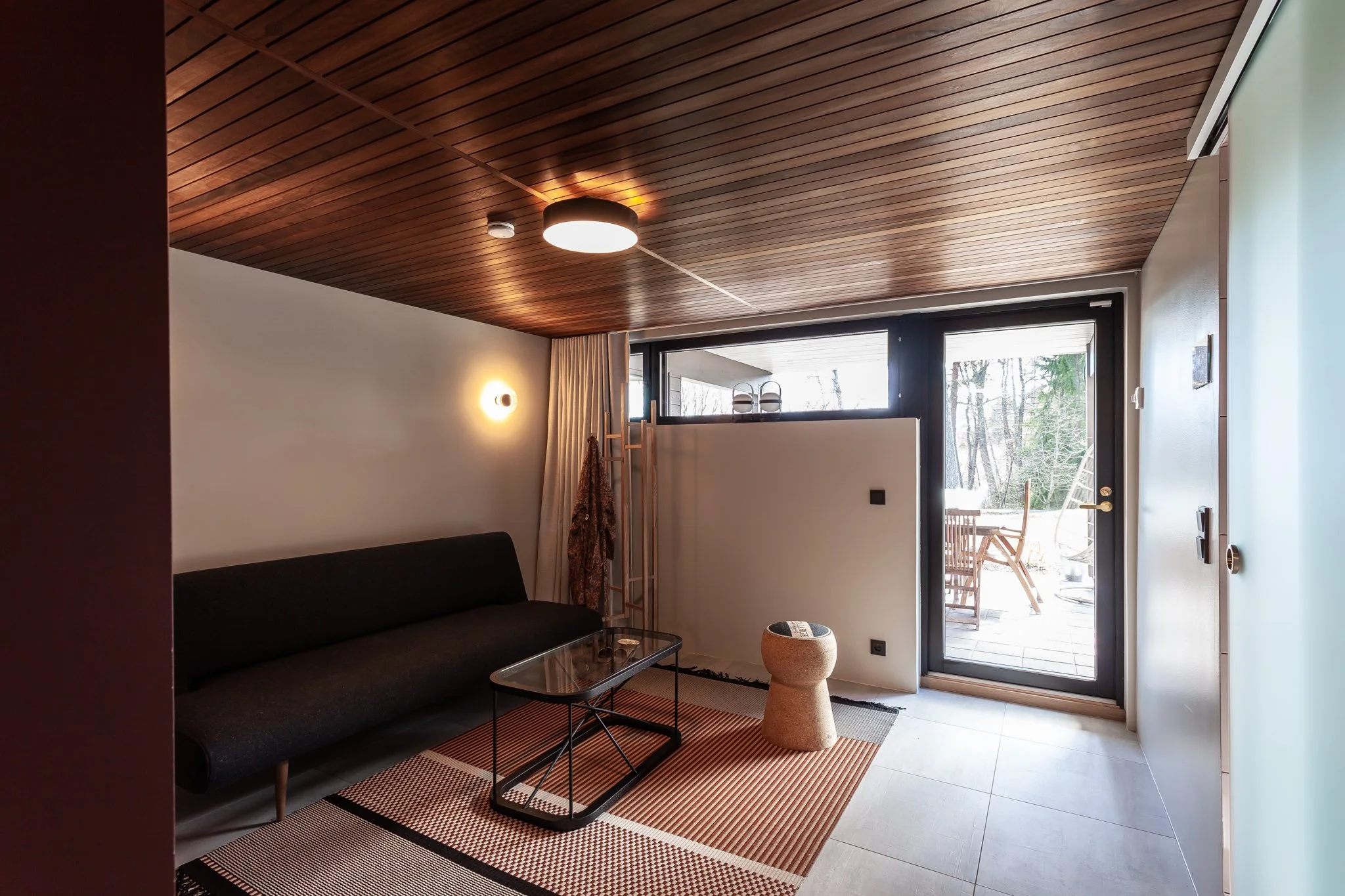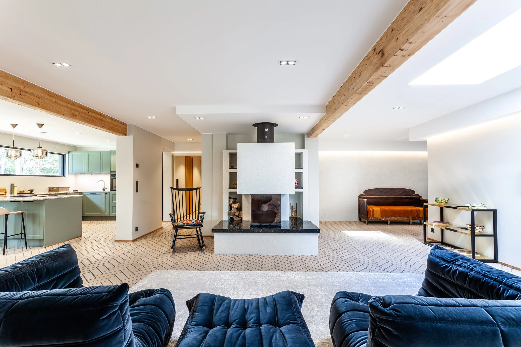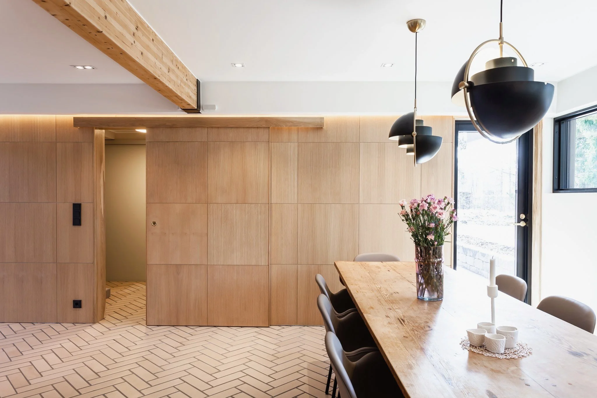 1970-luvun omakotitalo oli saneerauskohde ja se uudistettiin kokonaisvaltaisesti. Rakenteita päivitettiin ja tilat avattiin nykyajan tarpeisiin sopiviksi. Alkuperäistä arkkitehtuuria kunnioitettiin säilyttämällä ajalle tyypillisiä piirteitä, mutta pinnat, värit ja materiaalit päivitettiin moderniin, minimalistiseen tyyliin. Sisustuksessa yhdistettiin lämpimiä sävyjä, luonnonmateriaaleja ja ajattomia kalusteita. Lopputulos on upean raikas ja toimiva kokonaisuus jossa mennyt ja nykyaika kohtaavat saumattomasti.