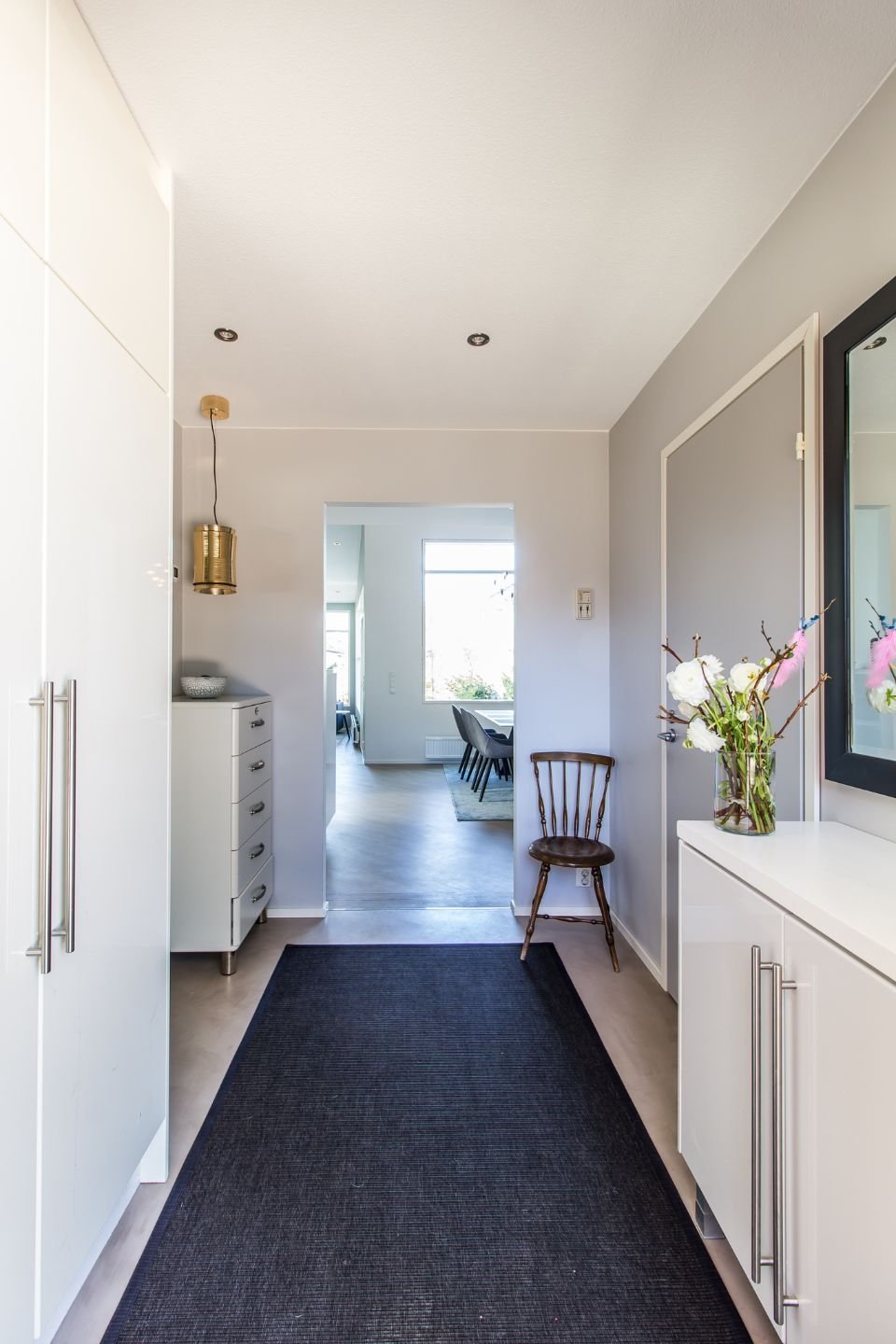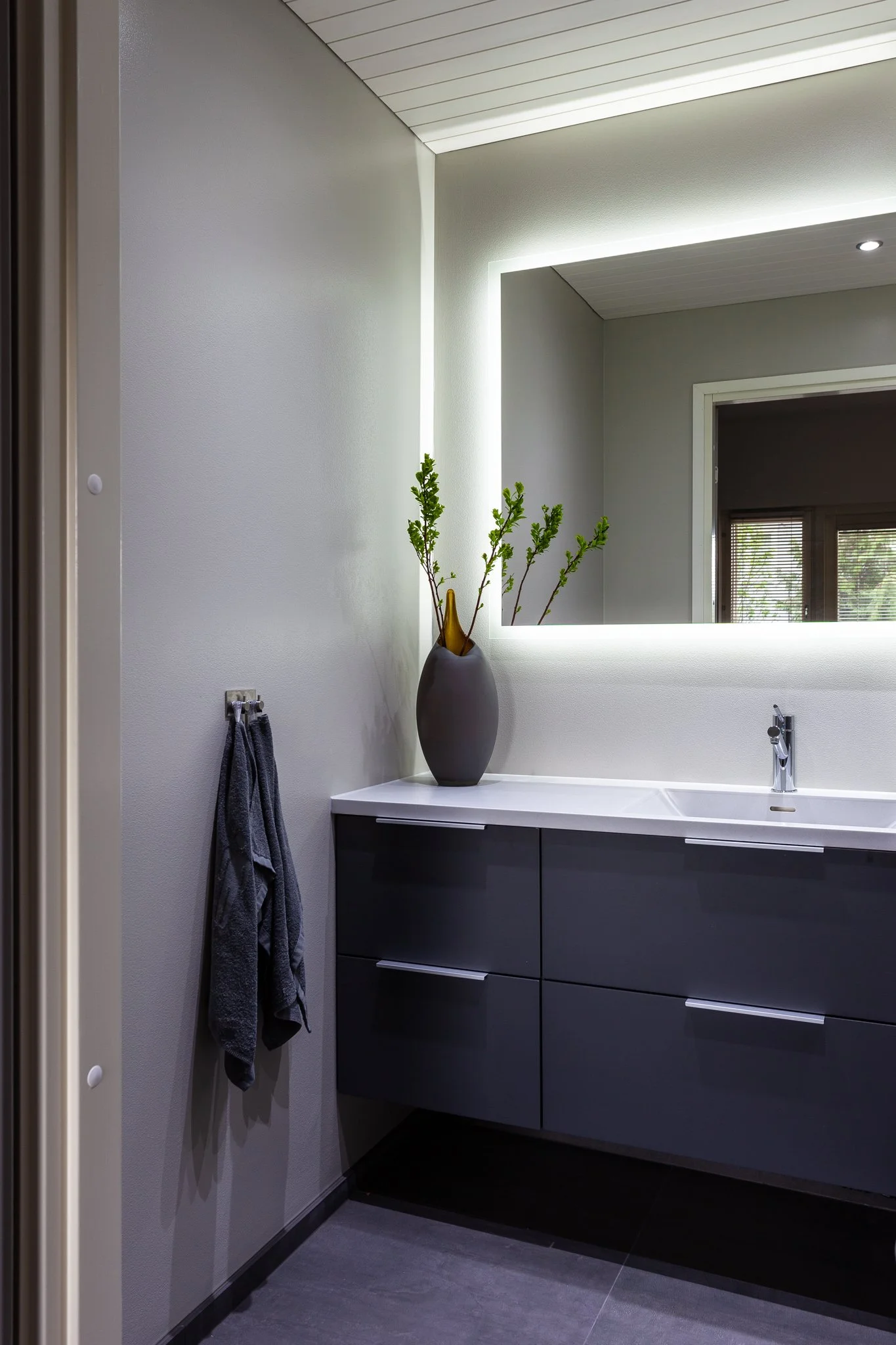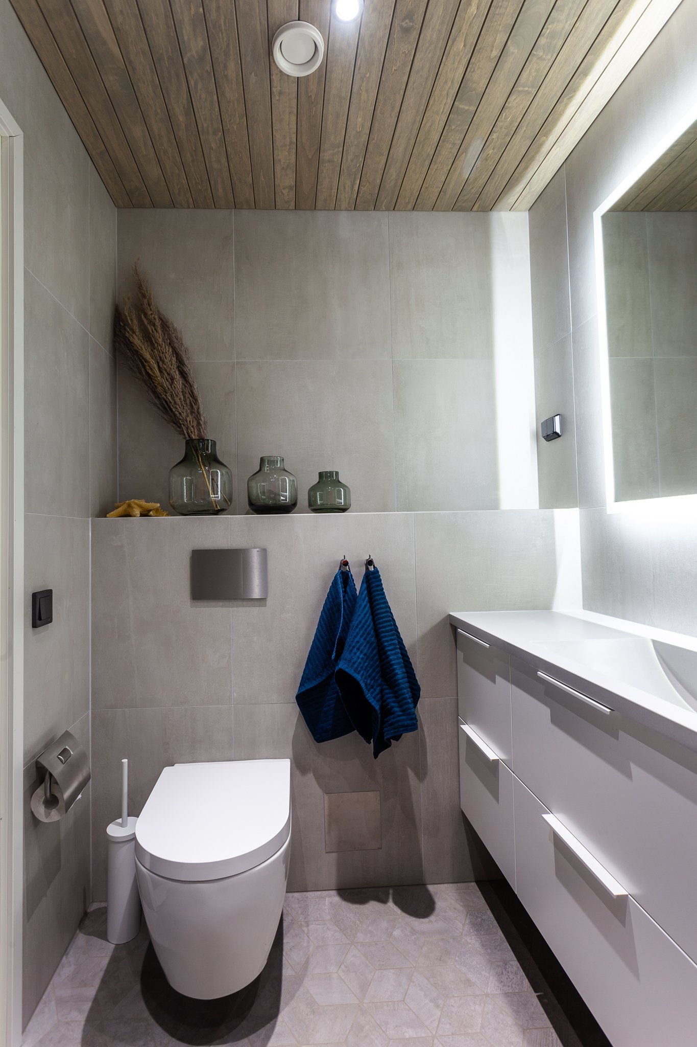 Paritalon remontissa käytettiin harmonisia harmaita ja sinisiä sävyjä, jotka toistuvat talon kokonaisuudessa. Ensimmäisessä vaiheessa päivitettiin pinnat, huonekalut ja valaistus, ja toisessa vaiheessa uusittiin kaikki märkätilat - kylpyhuoneet, pesuhuone ja sauna. Tämä värimaailma luo rauhallisen ja yhtenäisen tunnelman, joka tekee kodista modernin ja raikkaan.