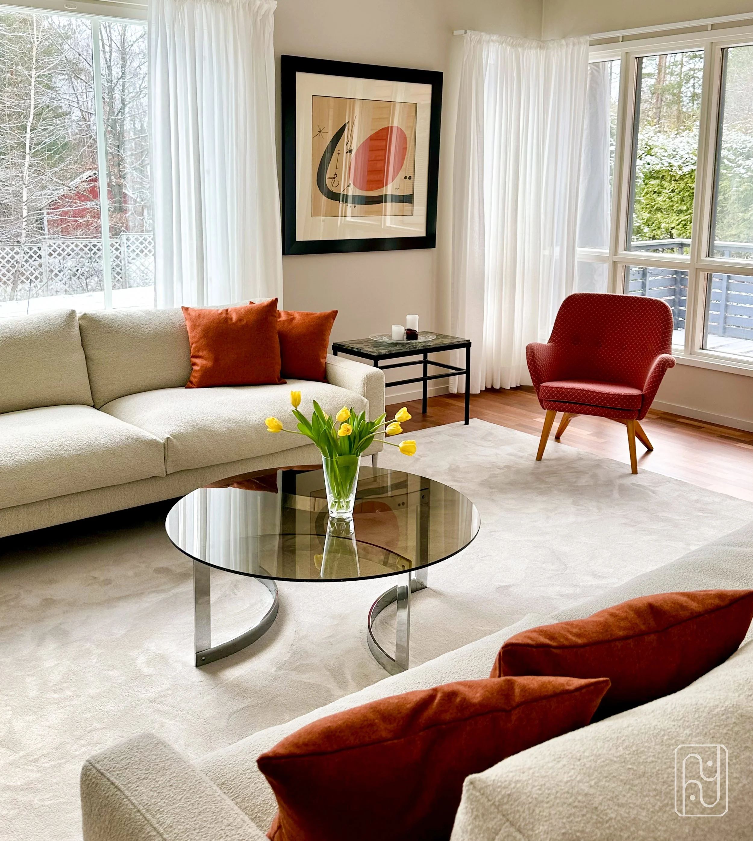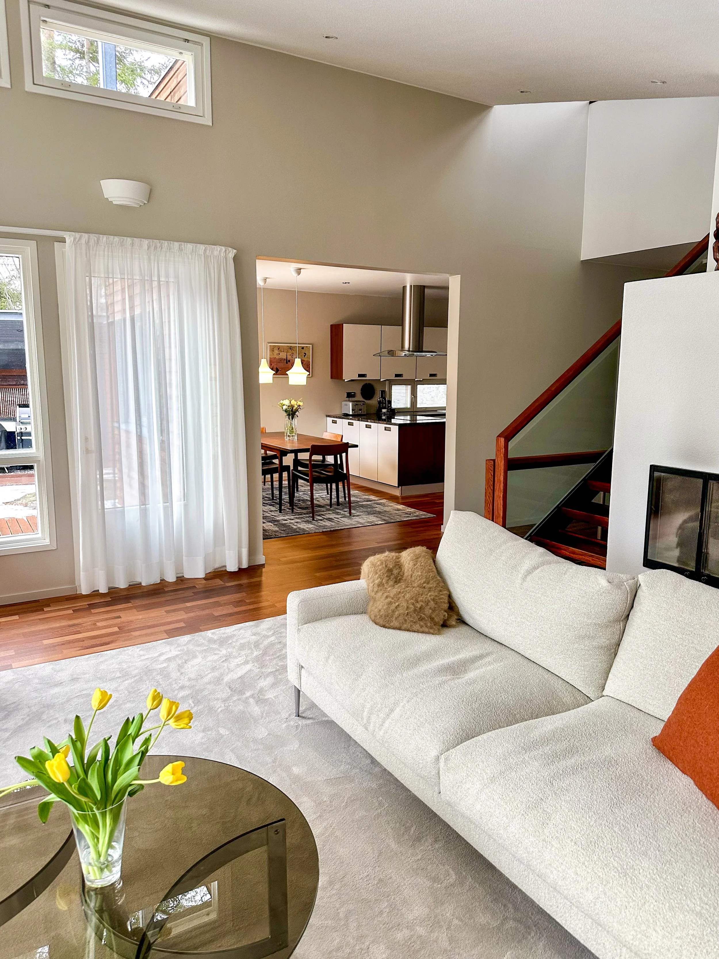 Espoolaiseen paritaloon kaivattiin ilmeen raikastamista.Suuria muutoksia ei tehty ja remontissa keskityttiin talon keski-kerrokseen. Lattiat hiottiin ja vahattiin, portaiden pinnat käsiteltiin, seinät ja katot maalattiin ja uusia irtokalusteita ja mattoja hankittiin. Myös valaistus ja osa valaisimista vaihdettiin.