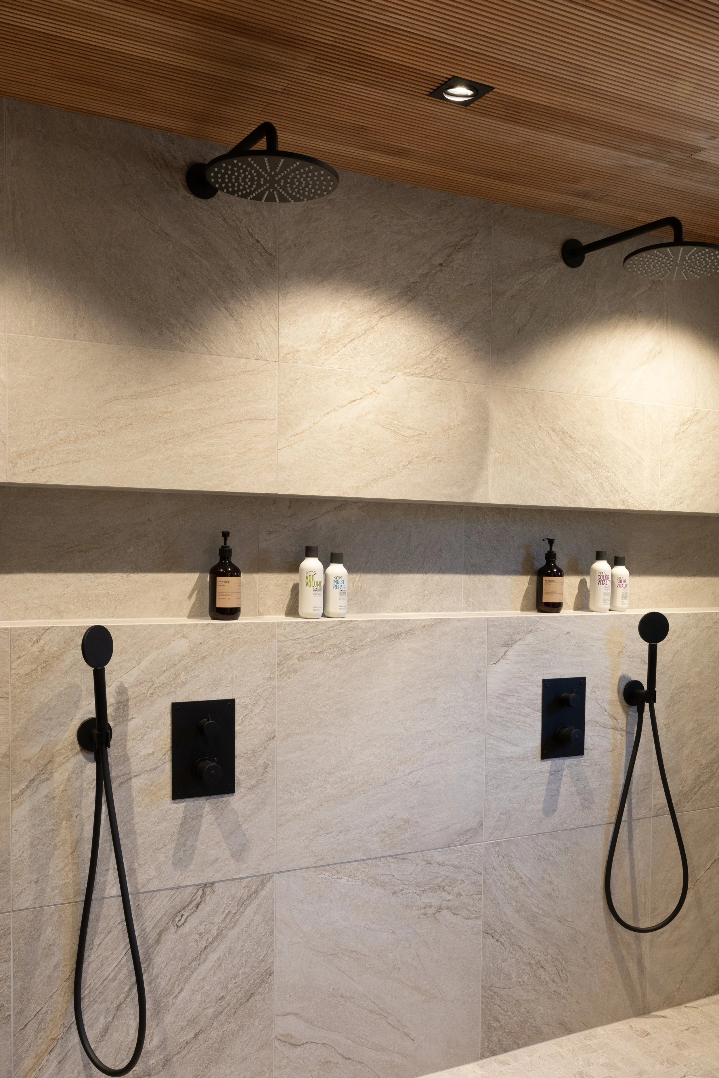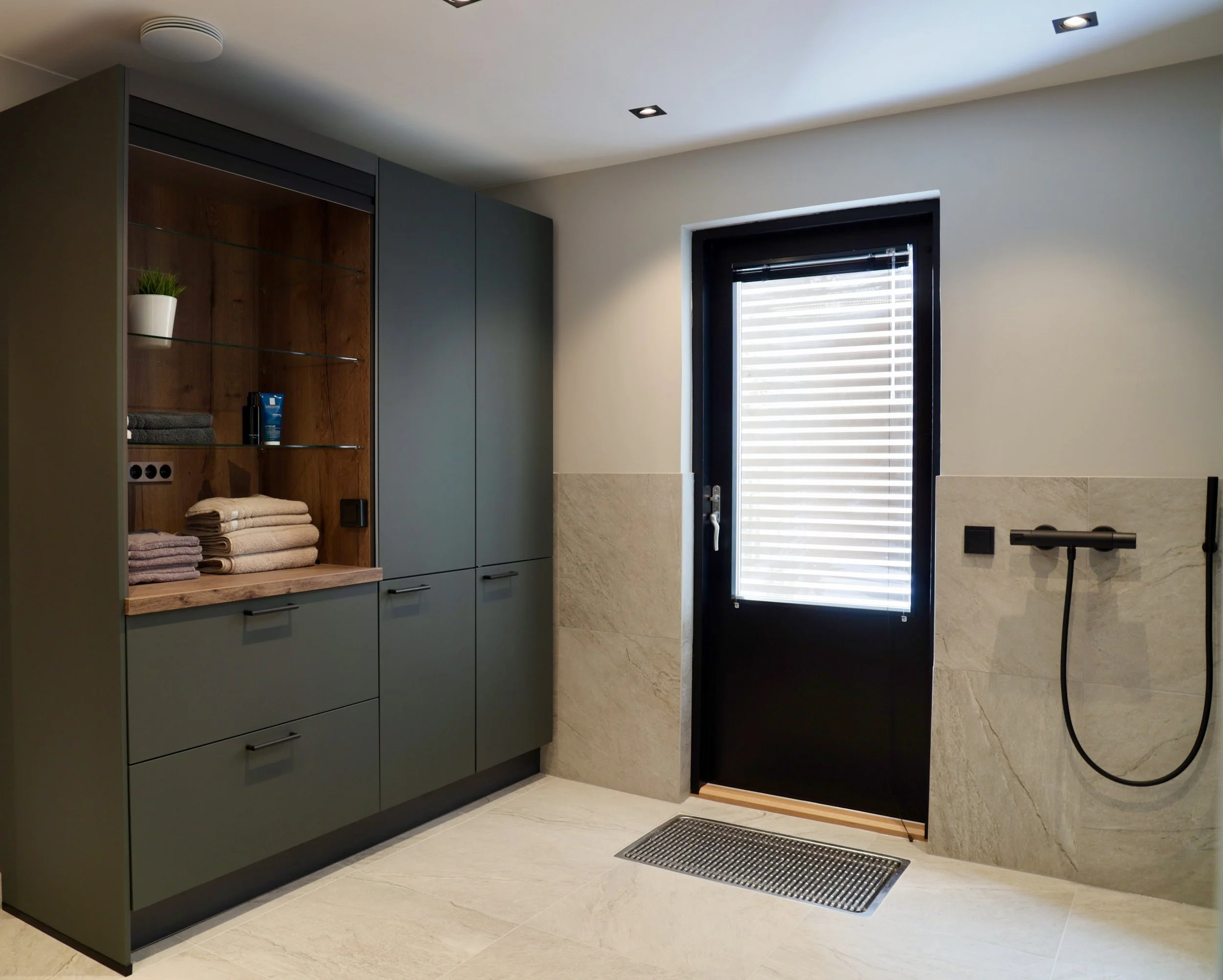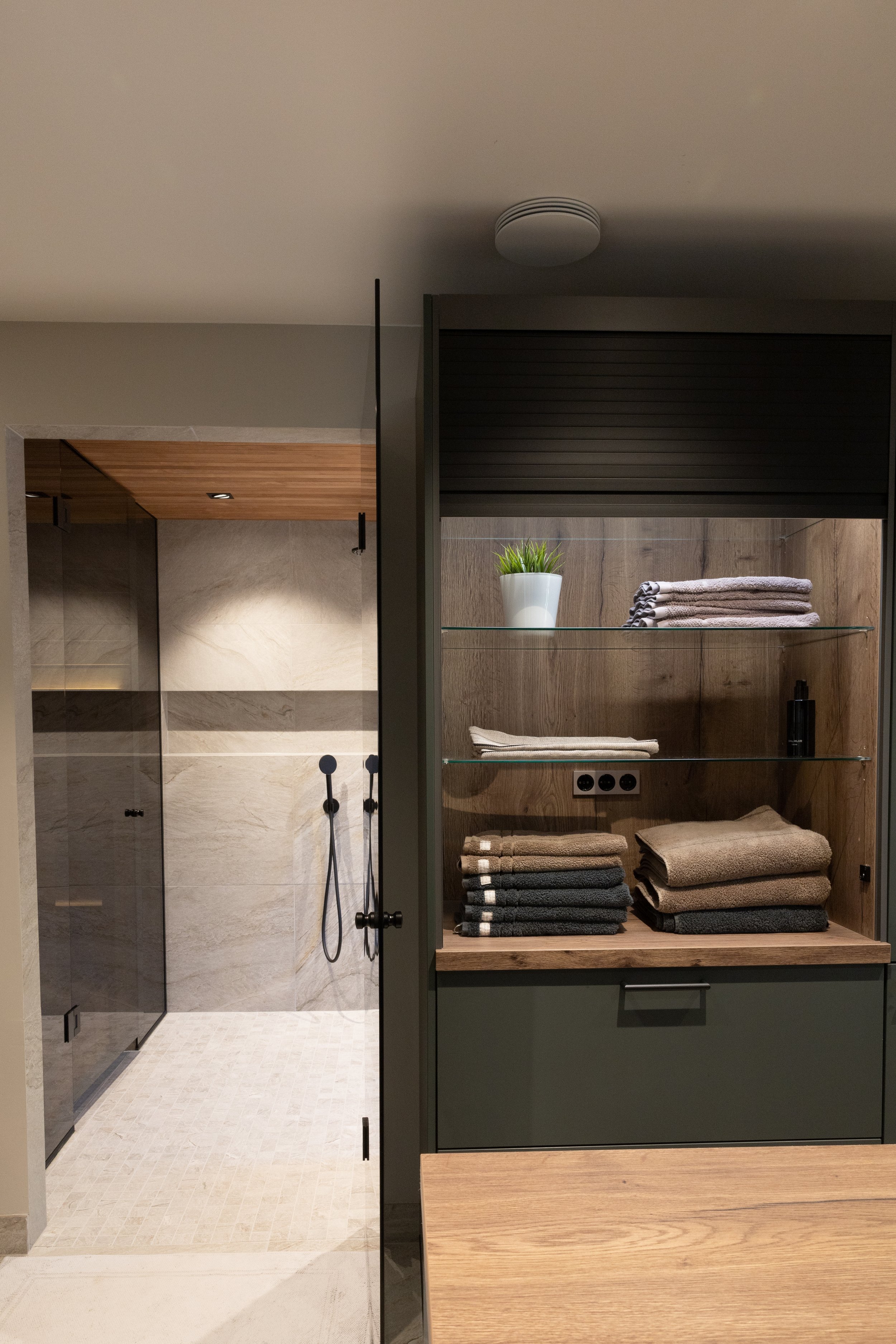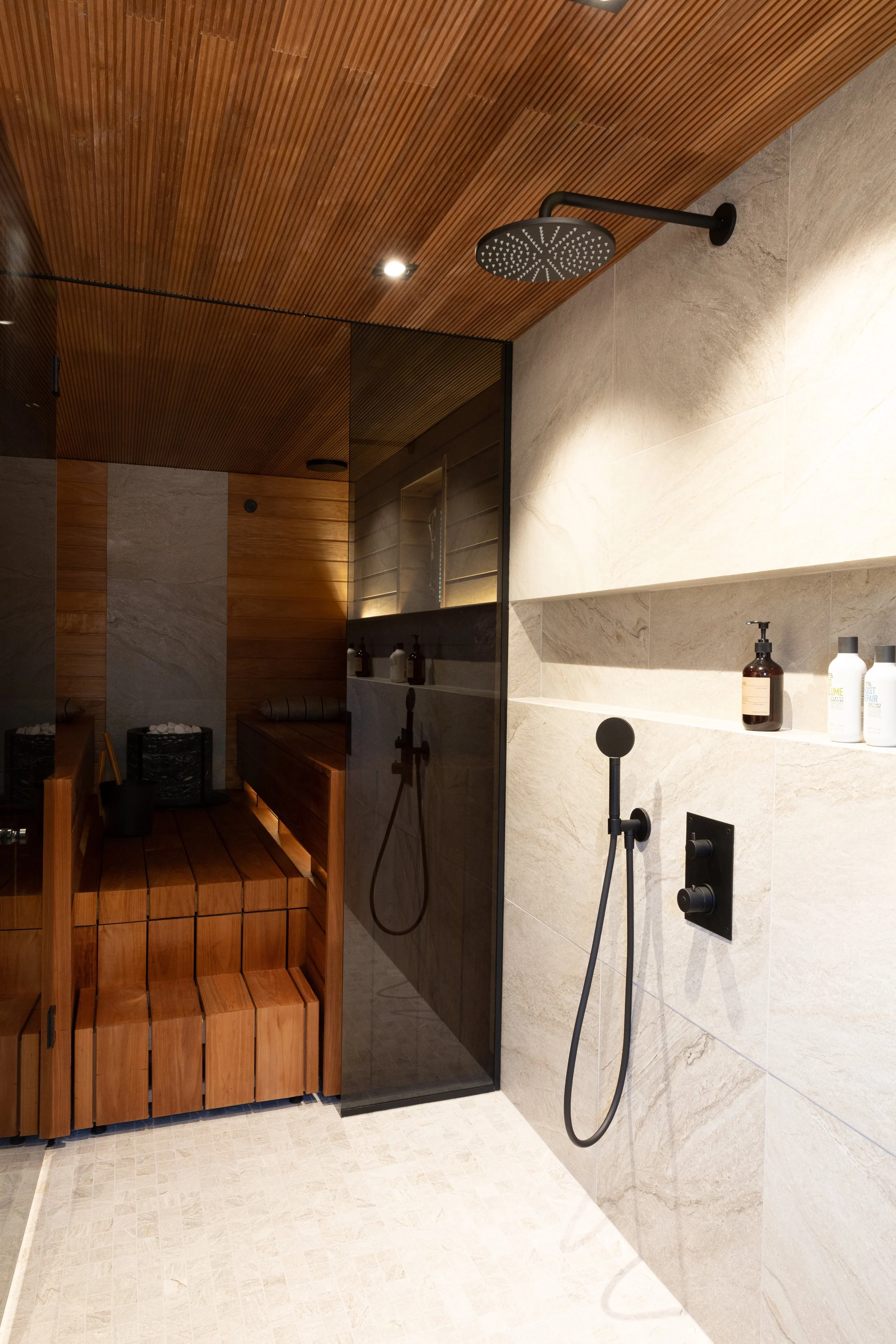 Reilu 20 vuotta vanhan paritalon kodinhoitohuone, pesuhuone ja sauna kokivat täydellisen muodonmuutoksen, kun haluttiin luoda koti-spa tunnelmaa. Sauna uusittiin ja pesuhuoneen turkoosit lasimosaiikki-laatat vaihdettiin uusiin, luonnonvärisiin laattoihin ja moderniin, minimalistiseen tyyliin. Saunassa panelointi vaihtui kauniiseen lämpö-haapaan ja kodinhoitohuoneessa uusittiin kaikki kiintokalusteet. Kaikkien tilojen valaistukset ja katot uusittiin. Lopputulos on rauhoittava ja seesteinen tila, jossa arjen kiireet unohtuivat. Myös viereinen pikku-WC uusittiin kauttaaltaan samoilla pintamateriaaleilla.