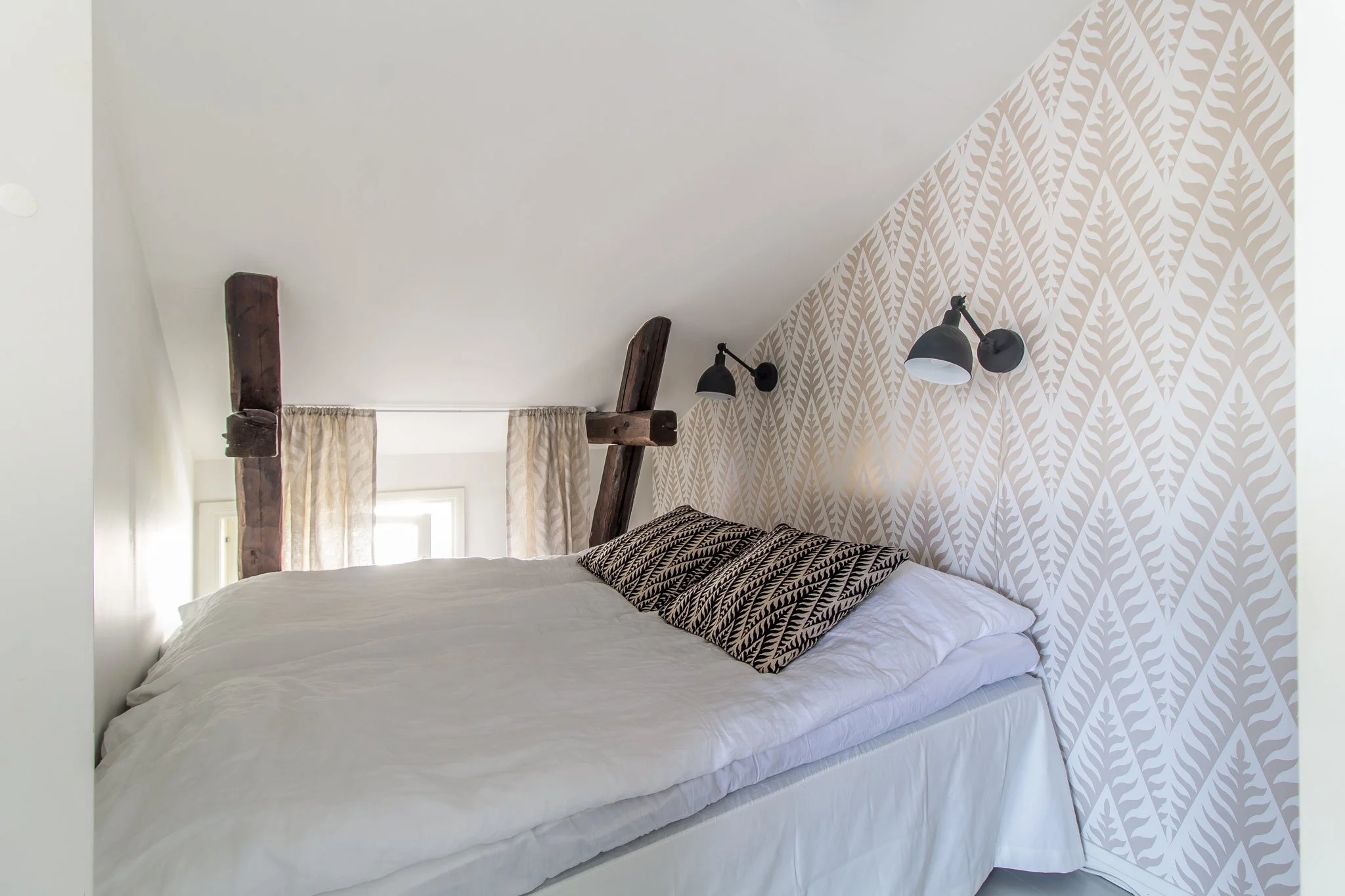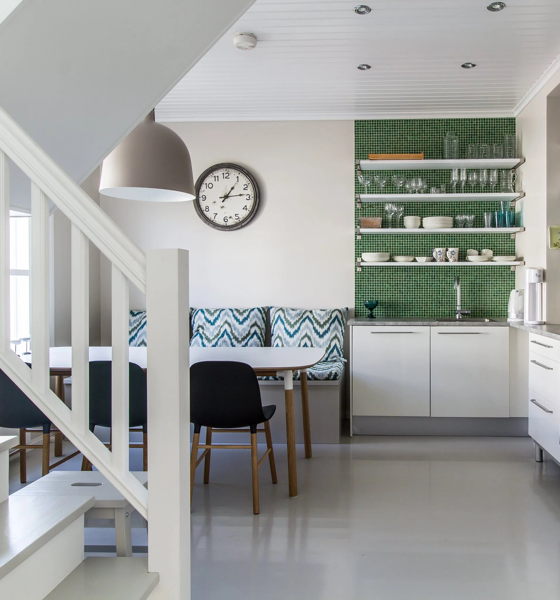 1880-luvun puutalo-osakkeessa toteutettiin päivitys sisustukseen ja värimaailmaan, kunnioittaen talon historiallista viehätystä ja arkkitehtuuria. Alkuperäiset yksityiskohdat säilytettiin, mutta värit päivitettiin raikkaiksi ja lämpimiksi, kesäkotiin sopiviksi. Vihreät ja korallin sävyt toistuvat sekä pintamateriaaleissa että tekstiileissä. Osa kalusteista uusittiin ja osalle päivitettiin verhoilukankaat. Lopputulos on harmoninen, raikas ja kodikas, yhdistäen vanhan ja uuden ainutlaatuiseksi tunnelmaksi.