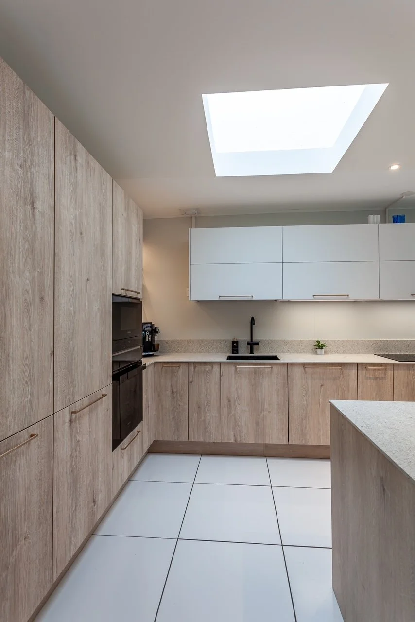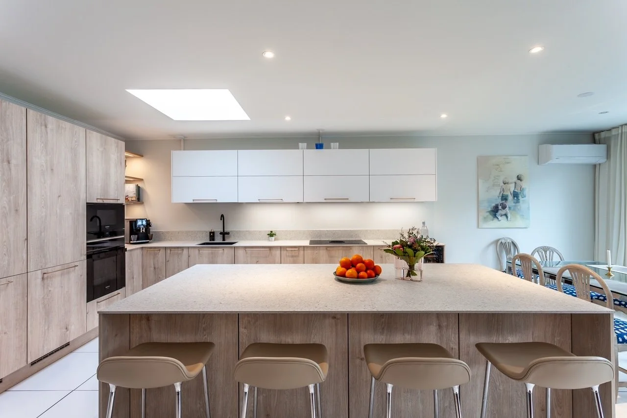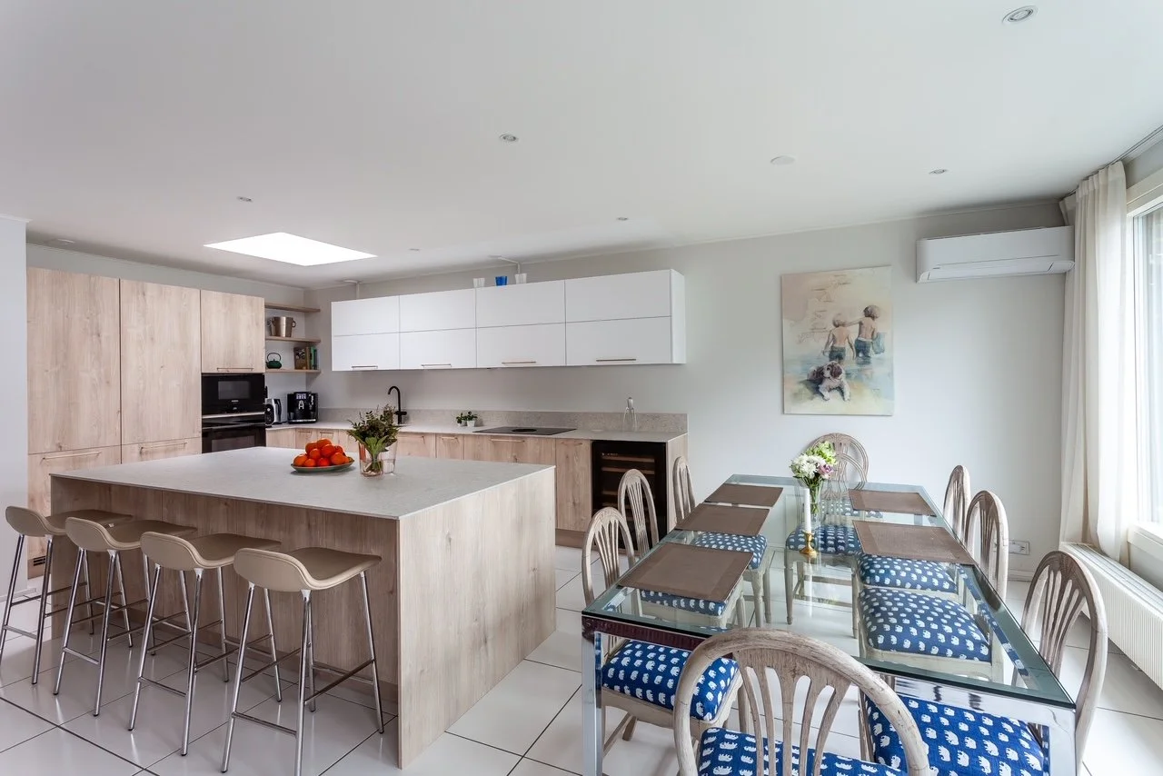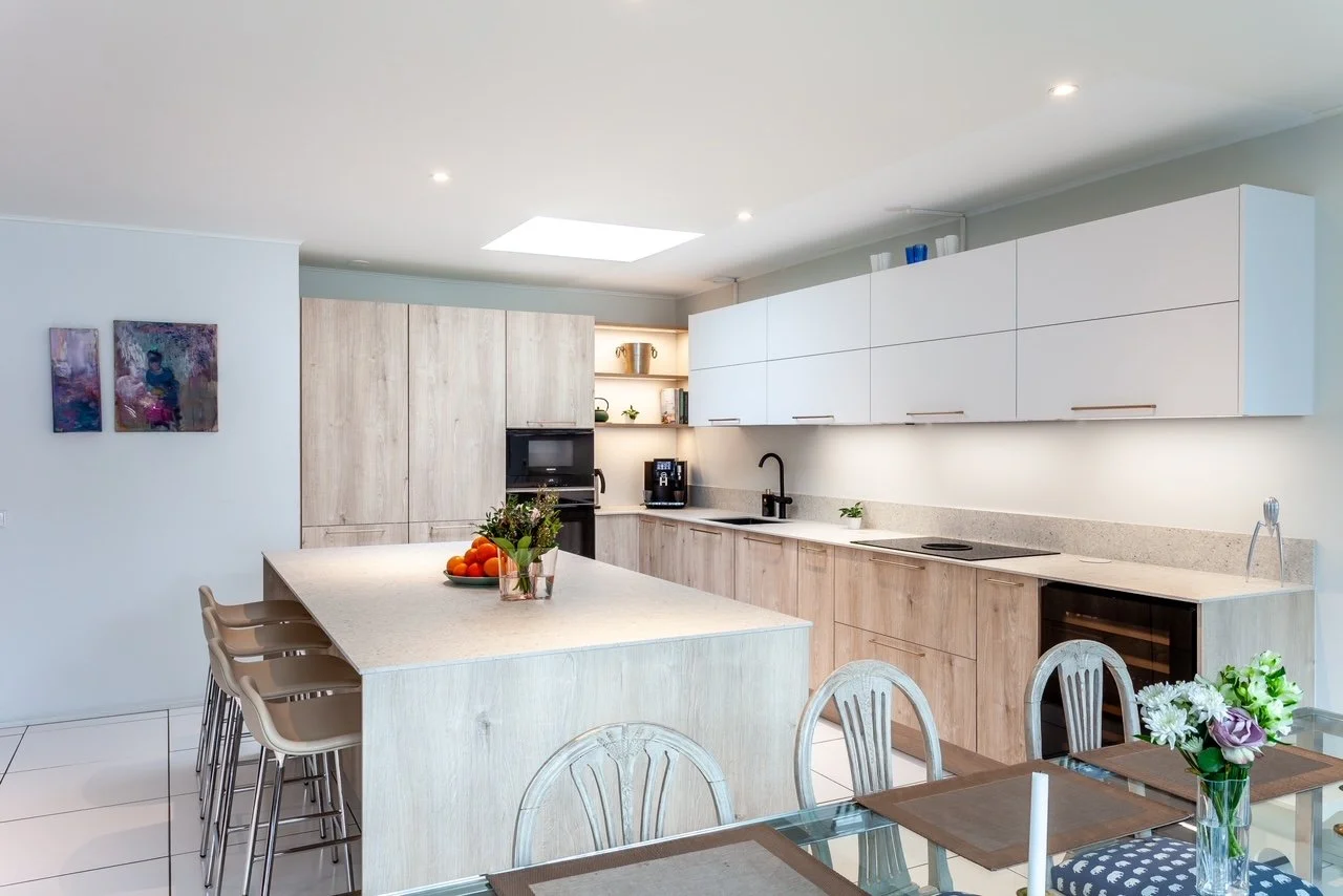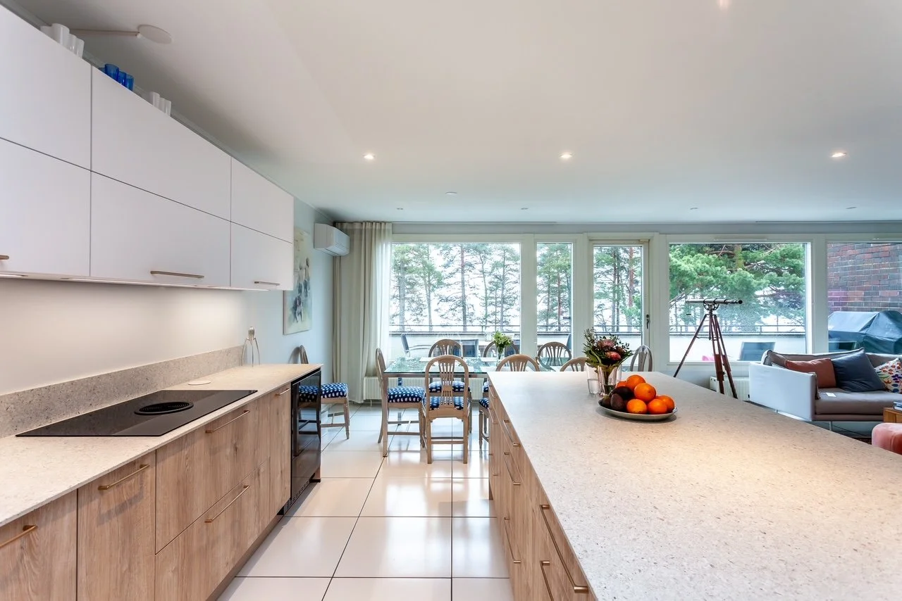 Lopulta päädyttiin myös keittiön kokonaisvaltaiseen uudistukseen, jossa käytettiin kestäviä materiaaleja ja raikkaita, vaaleita värejä. Uusi keittiö ja avara layout on tyylikäs ja käytännöllinen, tarjoten viihtyisän ympäristön koko perheelle.